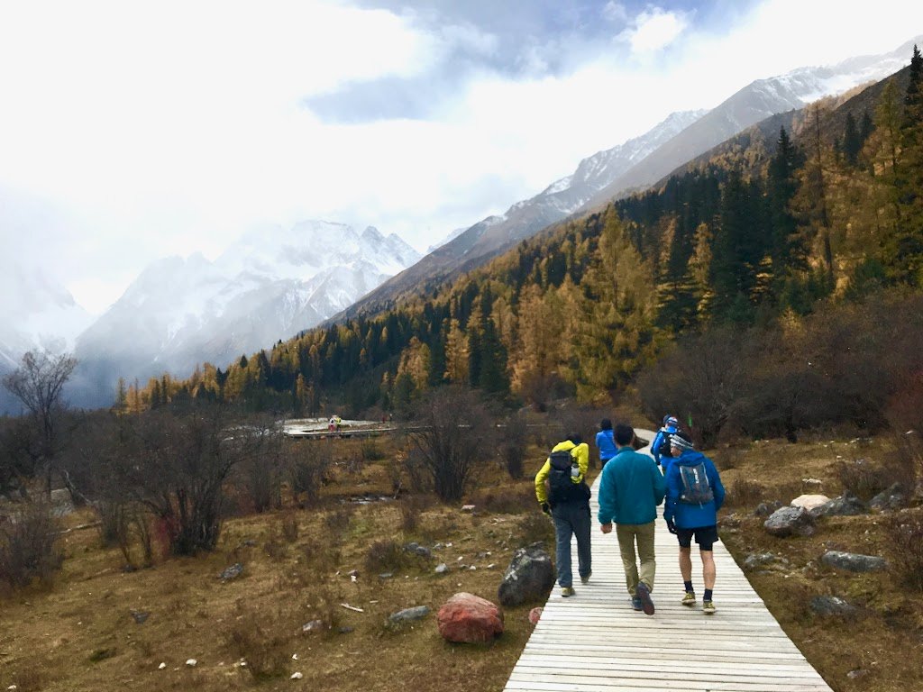 Right after the start, we climbed up the road until around 3500m elevation, and by the time we reached the first aid station, dawn broke and the mountains shining on the Morgenroth looked beautiful. From there we hit the trail and headed for the hiking trail along the river, looking up at the Four Girls Mountains in the forest where the panda was discovered. Since it was a pathway for horse trekking, we had to give way many times to the horse line and proceeded on the trail of mud, pebbles, and tree roots to avoid stepping on any lost items. Once in the park, the trail was a repetition of wooden paths and stairs, and we enjoyed the scenery at a leisurely pace, walking and stopping in line with the tourists.