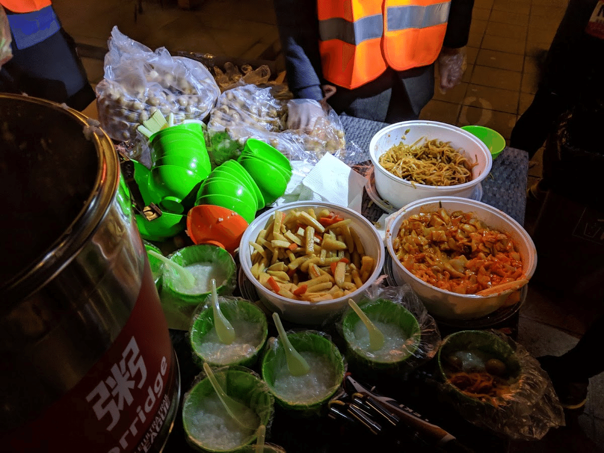 At CP4 (Jingshan Sub-district), the aid was a cafeteria in a residential area, where authentic Chinese food (stir-fried eggs and tomatoes, stir-fried vegetables, stir-fried meat, etc.) is served. Also, only one place offers steamed meat buns (baozi).