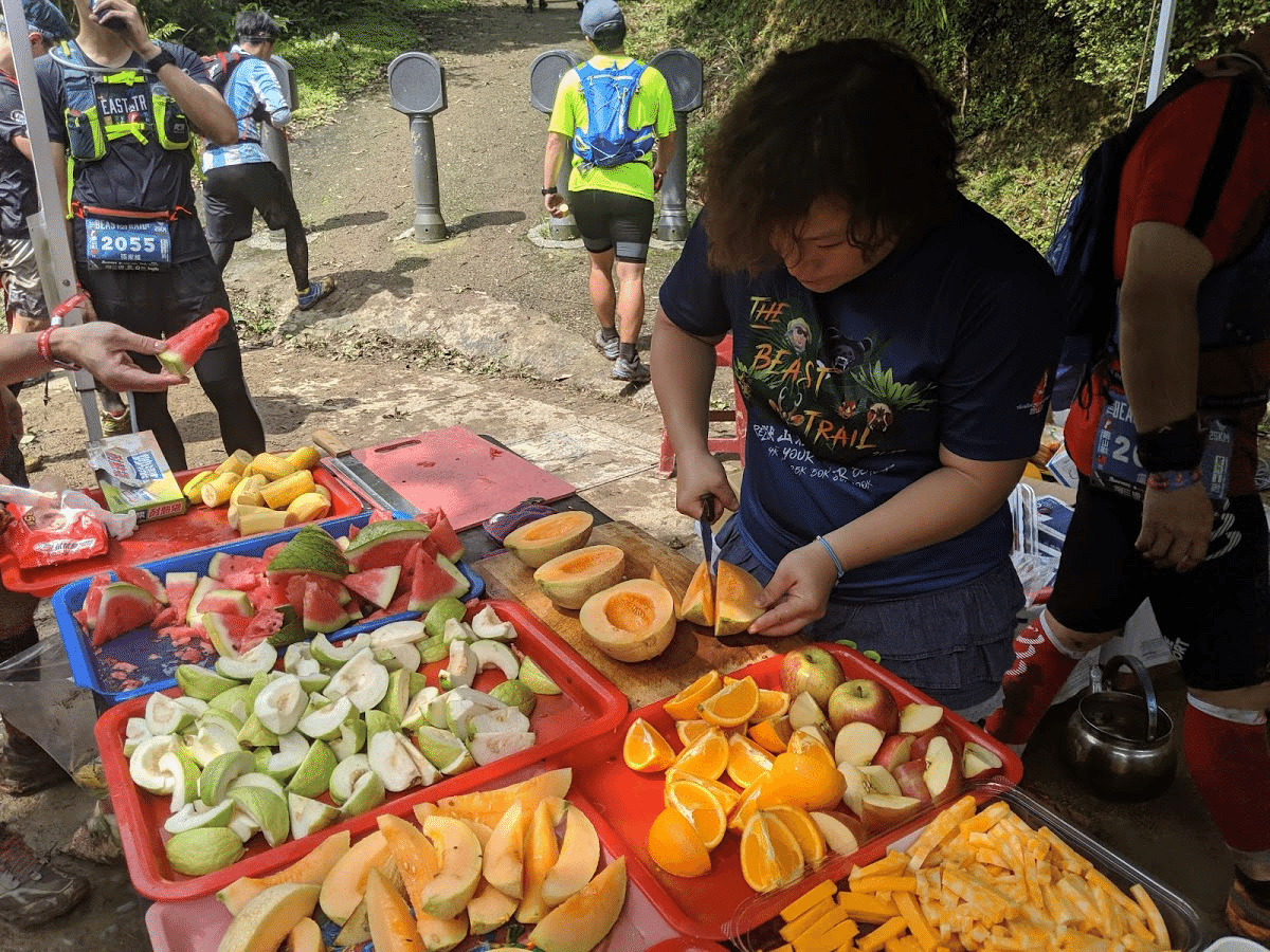 As one would expect from Taiwan, there was an abundance of fruit. Melons, watermelons, and oranges are perfect for such hot weather. Cheese, peanut butter sandwiches, and crackers were available, but I didn’t want to eat them in this heat, so I didn’t touch them at all. The powdered candy gels I brought from Japan and the colas provided at the aid stations were my energy source. Water, sports water, and cola were provided as drinks.