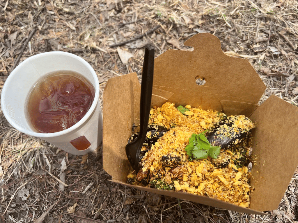 Right after the finish, I was in no condition to eat, but I knew that food was free, so I went to get some and got this. It was rice flour stir-fried with mussels and seafood. The drink on the left is called “winter melon tea,” a slightly sweet drink based on winter melon that is often seen in Taiwan.