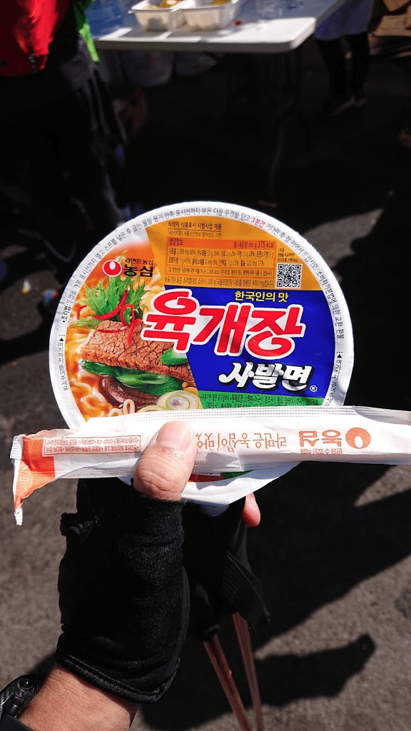 昨年出られた方より、カップ麺は辛ラーメンが出ると情報だったのだが、今年は辛ラーメンではないが辛いラーメンでした。全部飲み干すのはリスクがあるのだが、辛ラーメンよりはまろやかな味なので、なんとか食べられます。あと、さすがロッテのある韓国だけあって、チョコパイは毎エイドありました。正直飽きるwww