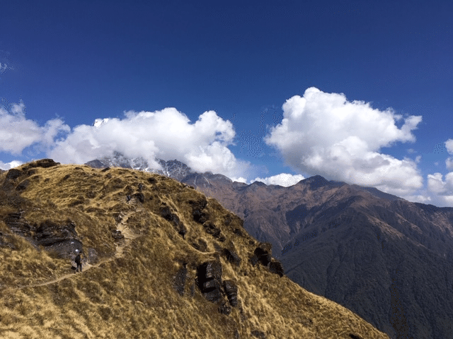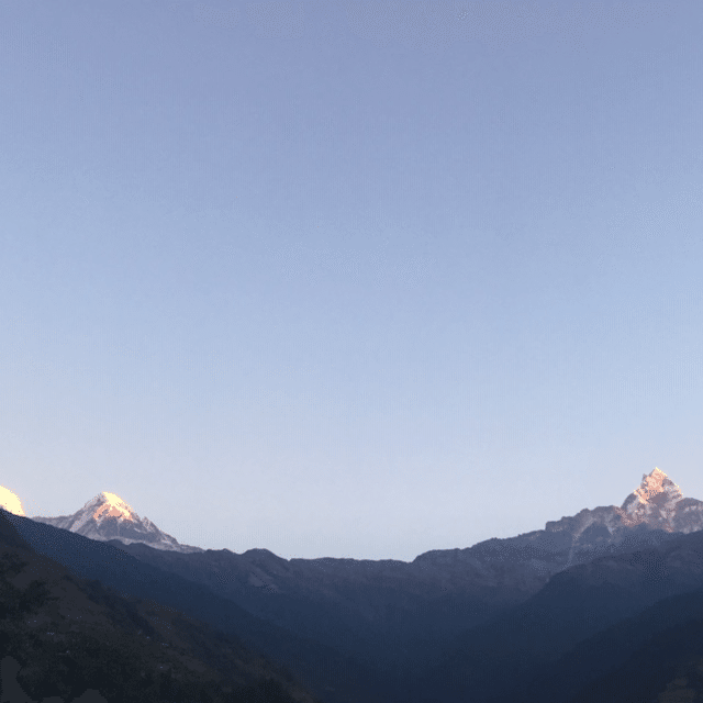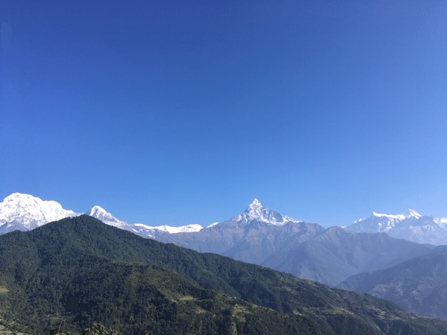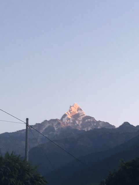 途中で夜が明けてきました。明るくなった景色の中に現れたのは、待ちに待っていたヒマラヤ山系のマチャプチャレとアンナプルナ南峰でした。これが見たくてここに来たんだ!あまりの美しさと雄大な姿に見とれてしまい、少し進んでは写真また少し進んでは写真とただでさえ遅いのに全然前に進めません。絶景を見ながら少しずつ前に進んでいきました。