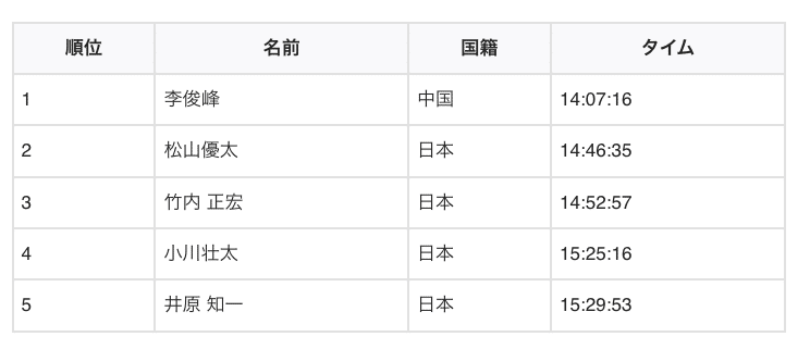 表彰式は104kmと65kmが対象です。まずは、65kmの部から表彰され、そのあと104kmの部が表彰されます。今回印象的だったのは、104kmの表彰台(1~5位)を日本人ランナーが寡占したということ。