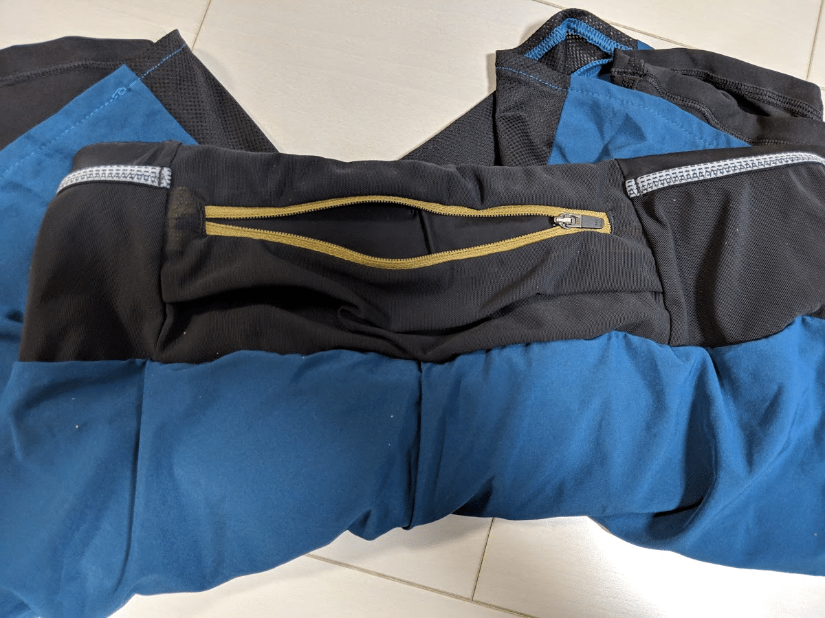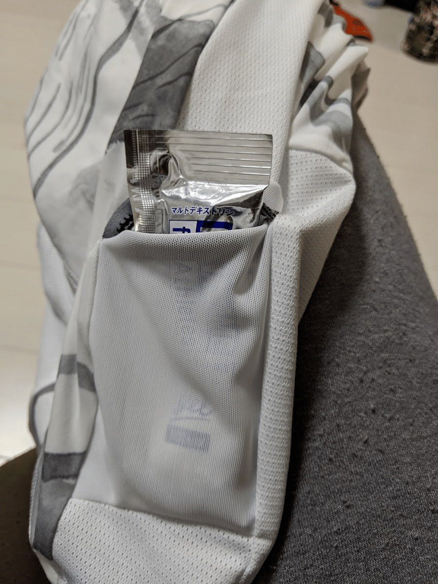 上のウェアは、生地が薄くて軽い。が、薄い分、強度は少し心配・・・でも、着心地は素晴らしく、特に脇下のフィット感がめちゃくちゃ素晴らしい。背面には、エナジージェルなどを入れる小さなポケットが2つあります。値段は3000円ぐらい。白基調でおしゃれなデザイン。
