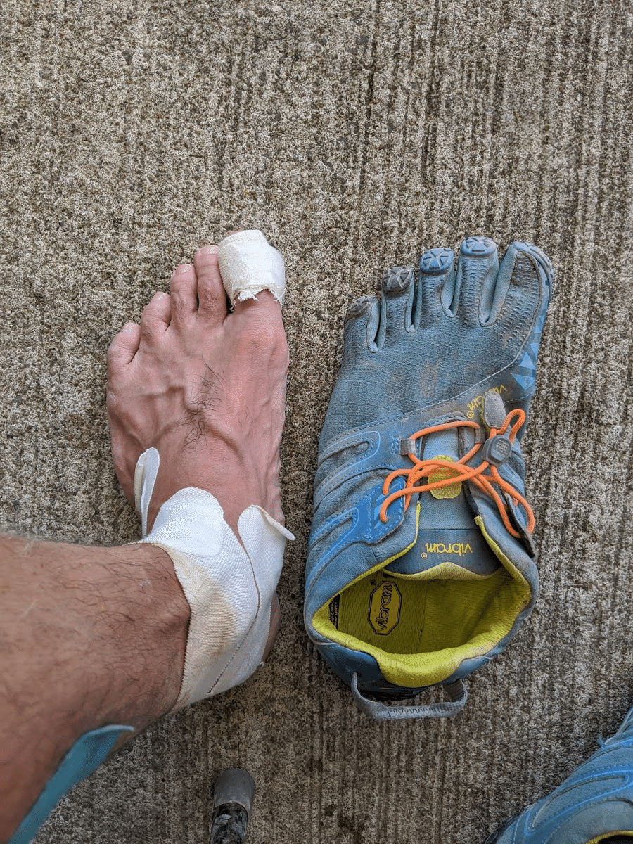状況を説明しておくと、比較的フラットよりの下り坂で、スピード出して走っていたら、思いっきり左の親指を思いっきりぶつけてしまう。かなり痛かった。声を上げるぐらいだった。Vibram FiveFingersは、つま先のプロテクションが皆無なので、ぶつけたときのダメージは半端ない。