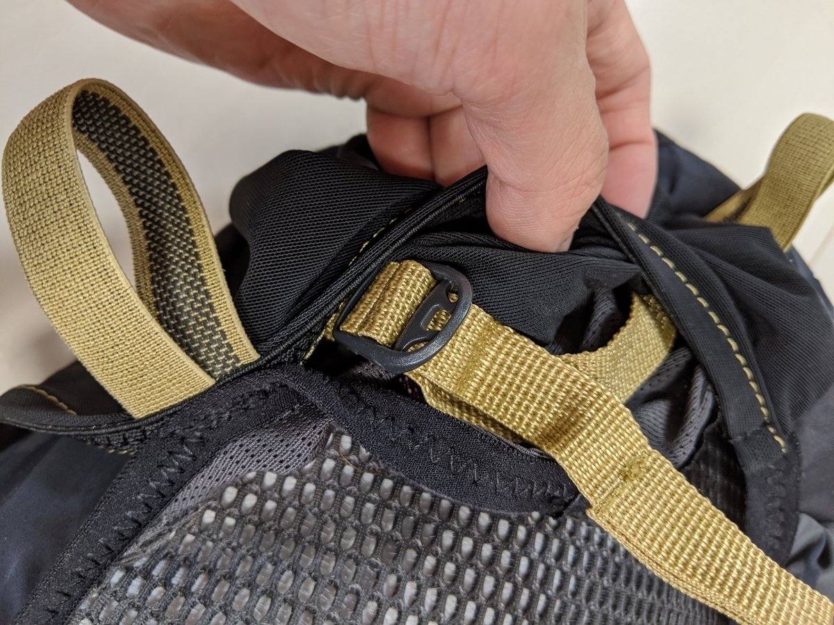 近年のライフスタイルやトレンドの事情を取り入れつつ、長時間行動し続けるウルトラトレイルにぴったりなザックというのが僕の第一印象。そして、軽量(360g)で、街中で背負ってもかっこいい黒基調のデザイン。伸縮性のある生地を使用しているため、割と詰め込んでも大丈夫。15リットル以上入るかもしれません。
