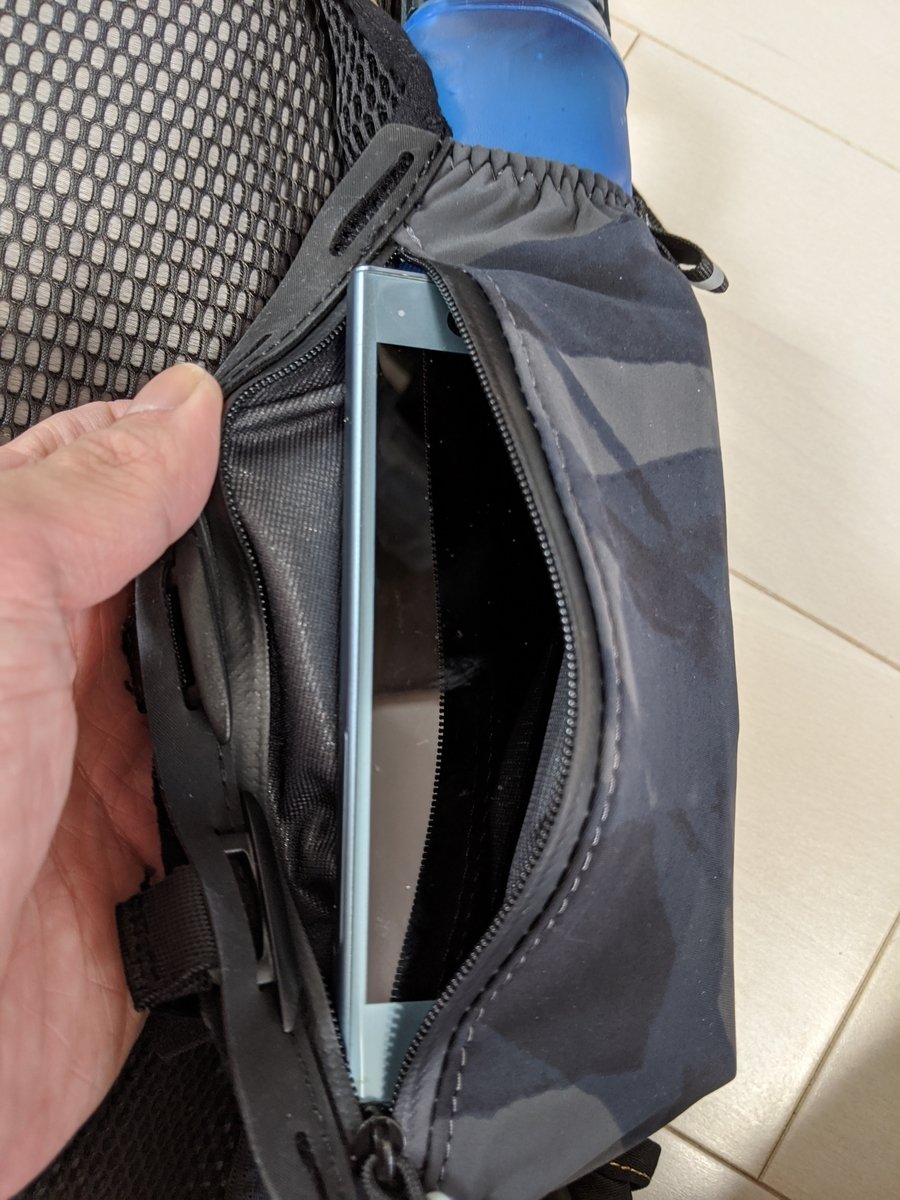 サイズ的には、僕の愛機であるGoogle Pixel 3(5.5インチ)なら余裕で入ります。なのでiPhoneの通常サイズなら問題ないでしょう。ただ、Pixel 3 XLぐらいのサイズだとおそらく入らないと思います・・・あと、ソフトフラスクを胸ポケットに入れている場合は、スマホを入れづらいところはありますのでご注意を。。。