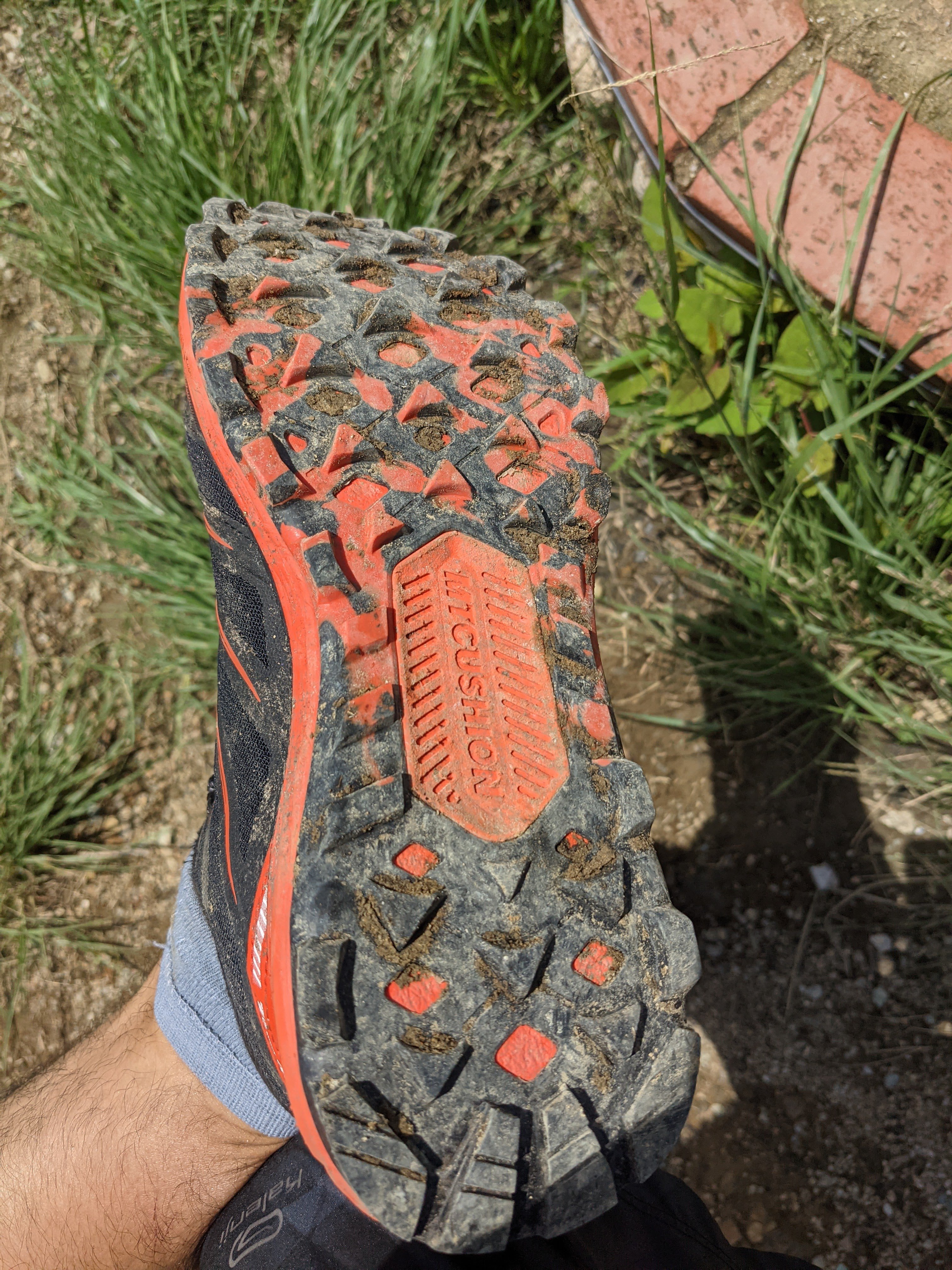 グリップ力に関しても良好ですね。マキシマム系トレイルシューズは、割とグリップのラグが浅めに作られていることが多いが、これも同じですね。ただ、私が走った範囲では、特に不安に感じることもないし、よくできていると思います。