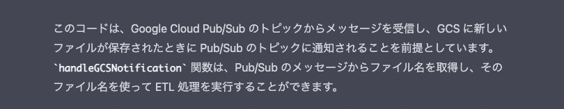 で、ChatGPT のすごいとろこは、単にコードを返すだけでなく、コードの下に簡単な解説をしてくれます。前提条件であったり、どういった用途で使われるかと言ったことを返してくれます。