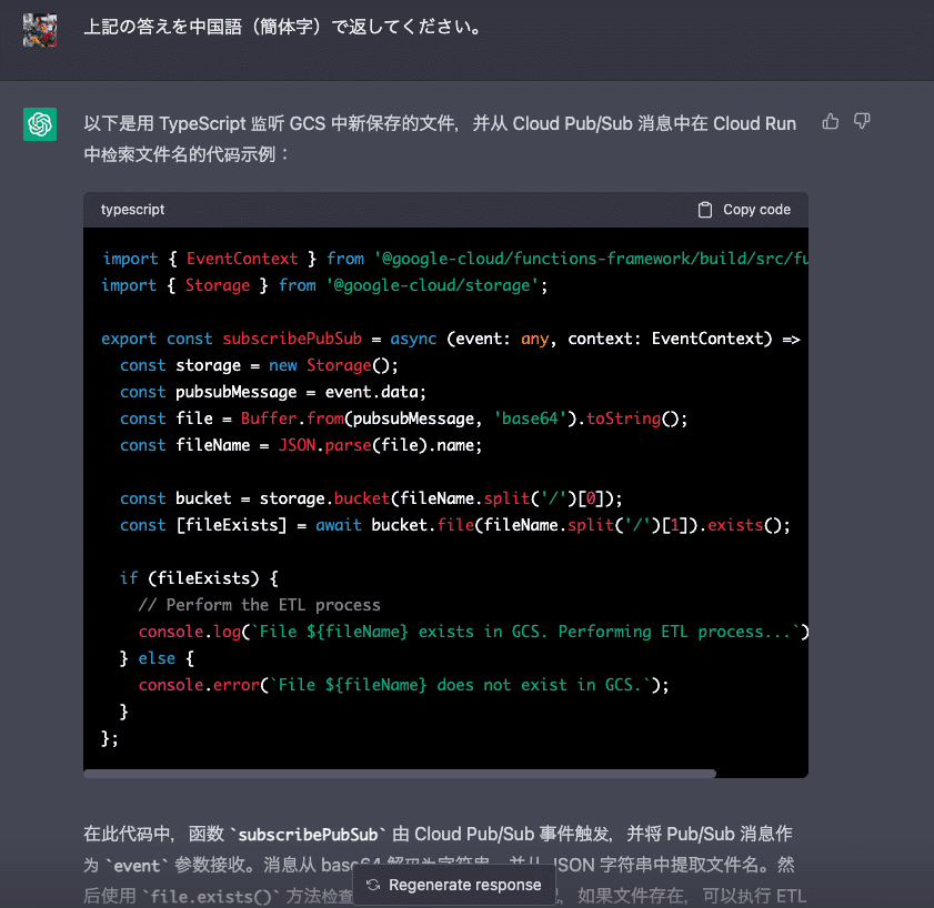 あと、ChatGPT のすごいところは、「プログラミング言語を Go から TypeScript に変えたい」といえば、TypeScript 版を返してくれるスグレモノです。