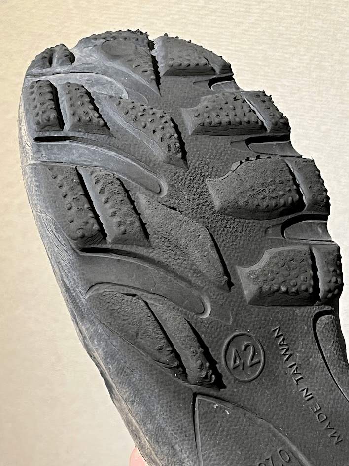 ロード、峠道、トレイル含めて、100km以上を走ったのだが、アウトソールの摩耗は激しい。まあ、ソール自体がかなり柔らかいので、予測はしていたものの、値段を考えると、想定の範囲内だろうか。ただ、この状態でも、意外にもグリップ力は維持できているような気がする。