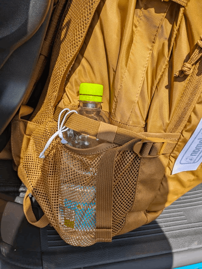 次に、ウォーカー33の両側面にはストレッチポケットもあり。これらはウォーターボトルや小さな雨具などを保持するのに便利。また、ポケットは伸縮性があるため、さまざまな形状とサイズのアイテムを安全に収納できる。ただ、ちょっとホールド力がないので、ペットボトルをそのまま入れると、落ちることがあるので、ベルトで縛ってあげる必要はある。